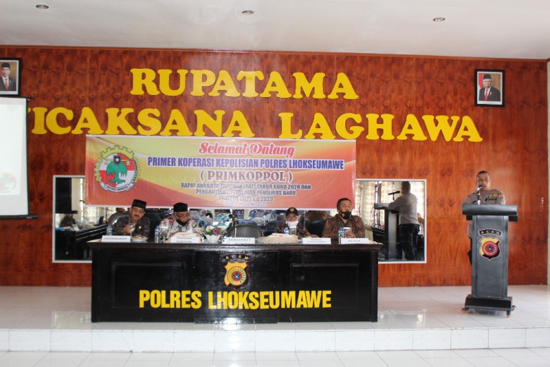 LHOKSEUMAWE – Primer Koperasi Kepolisia Polres Lhokseumawe (Primkopol) menggelar Rapat Anggota Tahunan (RAT) tahun buku 2020 dan pemilihan pengurus baru priode 2021sampai 2023 yang berlangsung di aula Rupatama Wicaksana Laghawa Polres Lhokseumawe, rabu (16/06)2021).