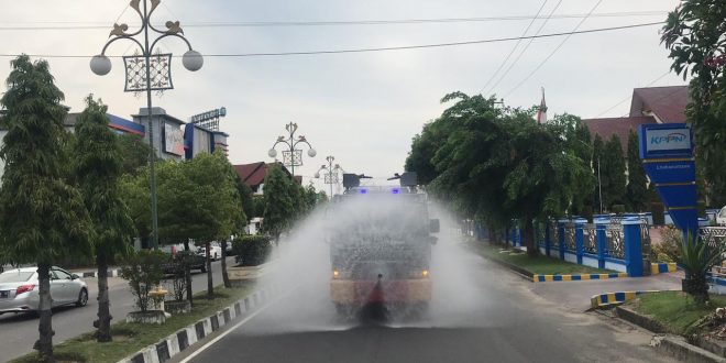 LHOKSEUMAWE – Tim Satgas Covid-19 Polres Lhokseumawe melakukan penyemprotan disinfektan di seputaran Kota Lhokseumawe, Rabu (9/6/2021). Dalam kegiatan itu, Polres Lhokseumawe mengerahkan satu unit mobil water Canon.