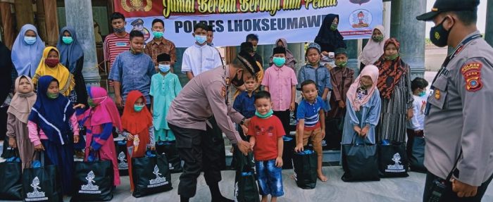LHOKSEUMAWE – Program Jumat Berkah Berbagi dan Peduli kepada anak-anak yatim yang diluncurkan Polres Lhokseumawe, Jumat (11/6/2021) mendapat sambutan hangat dari tokoh masyarakat. Sebab, program tersebut sangat membantu di saat pandemi Covid-19.