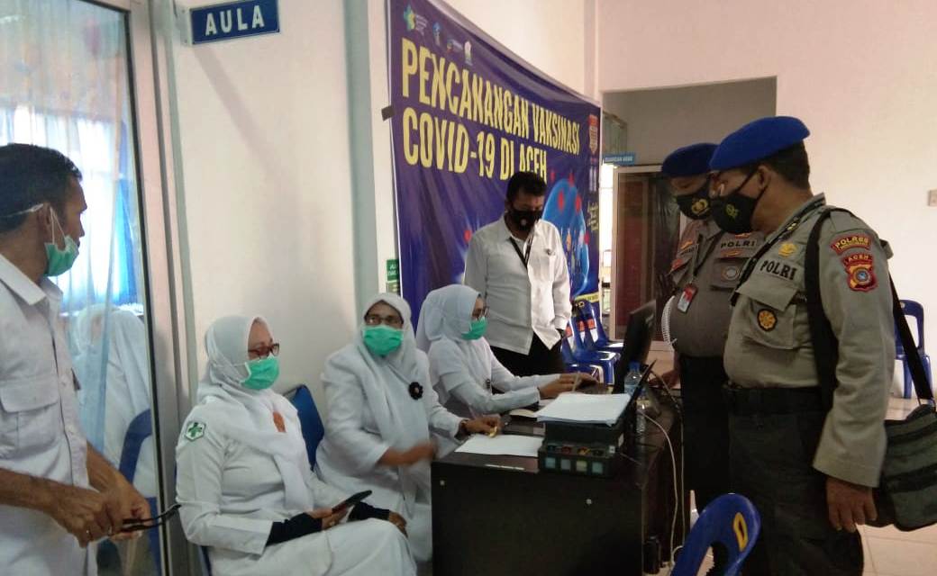 LHOKSEUMAWE -Tim pengawas Pemberlakuan Pembatasan Kegiatan Masyarakat (PPKM) Mikro Polres Lhokseumawe memantau kegiatan vaksinasi massal di Kecamatan Kuta Makmur, Aceh Utara, wilayah hukum Polres Lhokseumawe, Senin (21/6/2021).