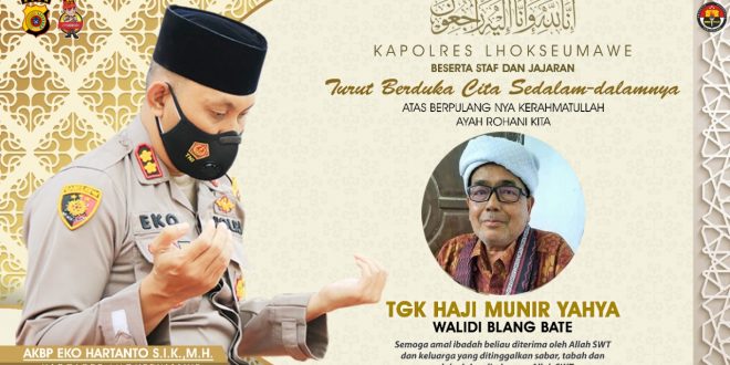 “Kapolres Lhokseumawe beserta staf dan jajaran mengucapkan duka cita sedalam-dalamnya atas berpulangnya ke Rahmatullah Tgk Haji Munir Yahya (Walidi Blang Bate),” ujar Kapolres Lhokseumawe.