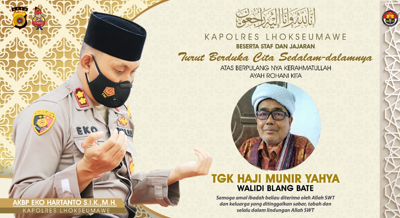 “Kapolres Lhokseumawe beserta staf dan jajaran mengucapkan duka cita sedalam-dalamnya atas berpulangnya ke Rahmatullah Tgk Haji Munir Yahya (Walidi Blang Bate),” ujar Kapolres Lhokseumawe.
