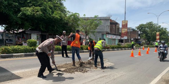 LHOKSEUMAWE – Guna mencegah terjadinya insiden kecelakaan lalu lintas, Sat Lantas Polres Lhokseumawe bersama stakeholder terkait menambal lubang di badan jalan jalur lintas Nasional, Gampong Panggoi, Kec. Muara Dua, Kota Lhokseumawe, Jumat (30/7/2021).