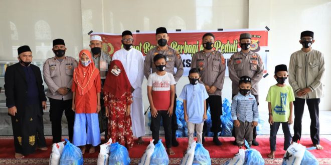 LHOKSEUMAWE – Kapolres Lhokseumawe AKBP Eko Hartanto SIK MH menyerahkan langsung bantuan sembako kepada puluhan anak yatim di Masjid Syura, Kandang, Kecamatan Muara Dua, Kota Lhokseumawe, Jumat (9/7/2021).