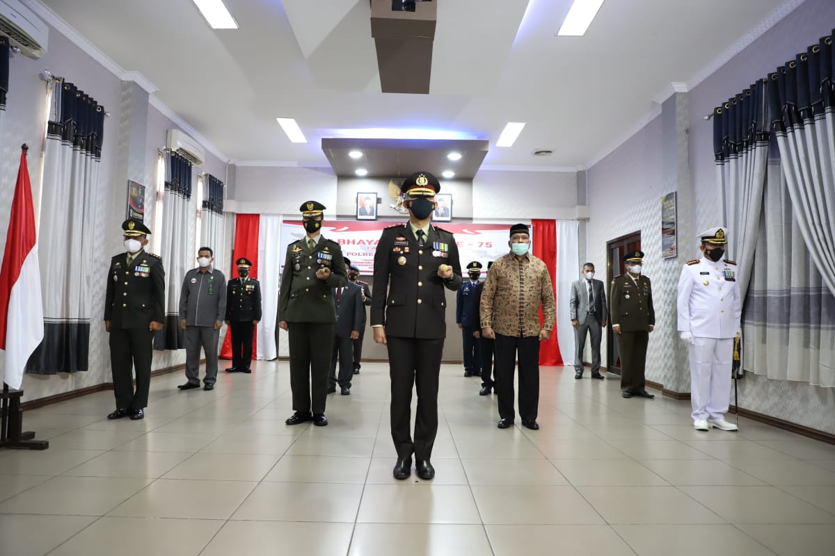 Upacara yang dipimpin Kapolres Lhokseumawe AKBP Eko Hartanto, S.I.K, M.H diikuti Forkopimda setempat. Peringatan HUT Bhayangkara Ke-75 tahun ini mengusung tema ‘Transformasi Polri yang Presisi mendukung percepatan penanganan Covid-19 untuk masyarakat sehat dan pemulihan Ekonomi Nasional menuju Indonesia Maju’.