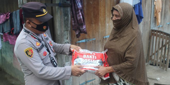 LHOKSEUMAWE – Personel Polsek Banda Saki menyalurkan bantuan sembako kepada 20 warga kurang mampu terdampak Covd-19 di wilayah hukum Polsek Banda Sakti, Kamis (22/7/2021).