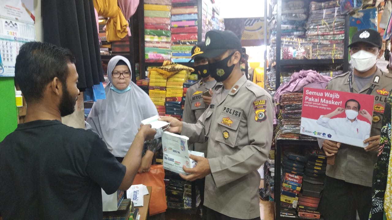 LHOKSEUMAWE – Personel Polsek Muara Satu, Polres Lhokseumawe melaksanakan kegiatan Pemberlakuan Pembatasan Kegiatan Masyarakat (PPKM) Mikro di Pasar Batuphat, Muara Satu, Kota Lhokseumawe, Kamis (29/7/2021). Dalam kegiatan ini, personel mensosialisasikan 5 M kepada masyarakat.