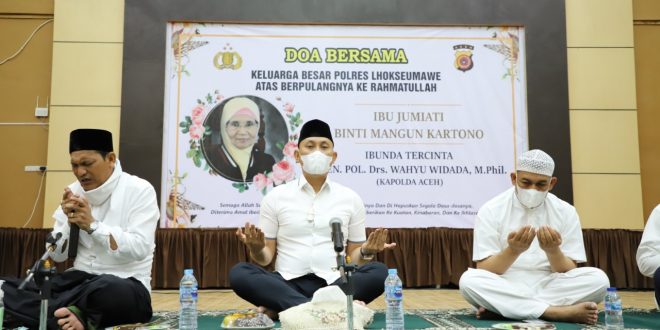 LHOKSEUMAWE – Polres Lhokseumawe gelar doa bersama untuk Ibunda Kapolda Aceh, kegiatan ini berlangsung di Gedung Serbaguna Polres Lhokseumawe, Jum’at (2/7/2021) malam.
