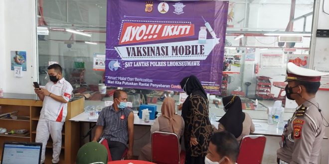 LHOKSEUMAWE – Sat Lantas Polres Lhokseumawe menggelar Vaksinasi Mobile ke dealer motor di wilayah hukum Polres Lhokseumawe, Sabtu (10/7/2021).