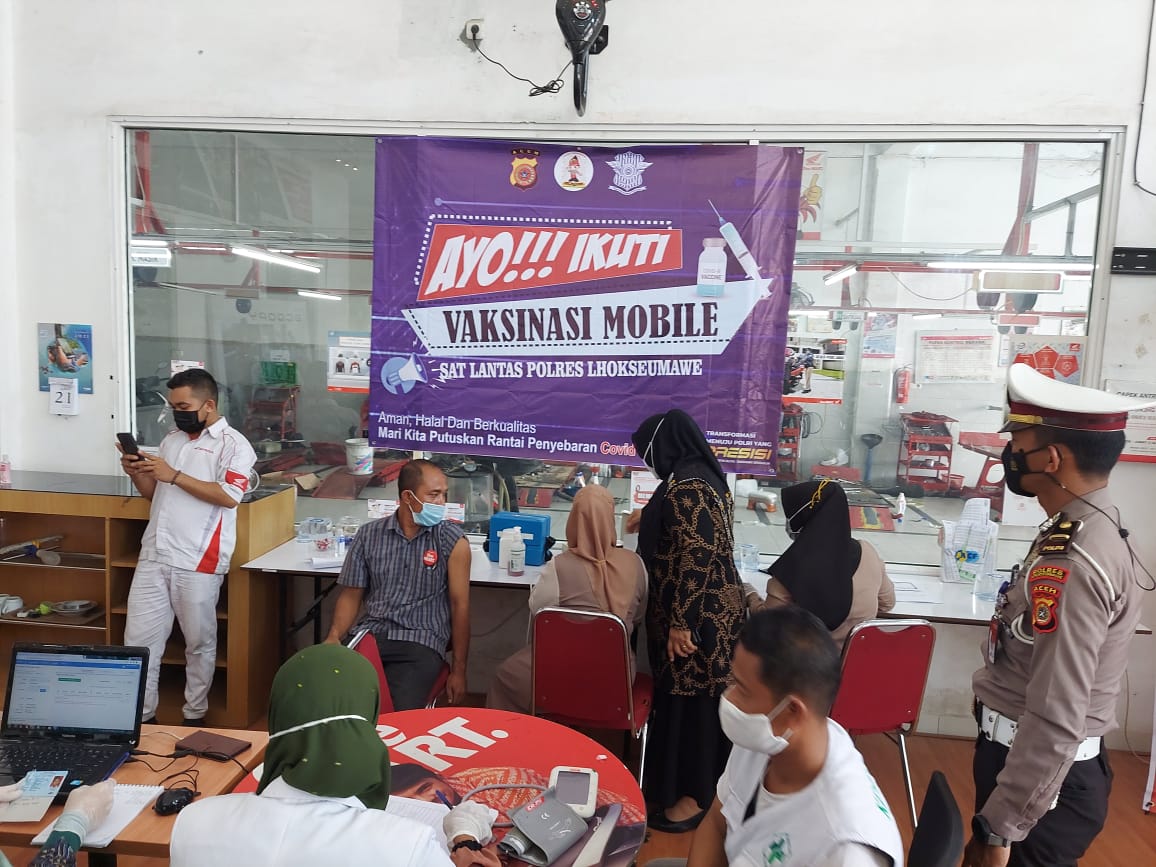 LHOKSEUMAWE – Sat Lantas Polres Lhokseumawe menggelar Vaksinasi Mobile ke dealer motor di wilayah hukum Polres Lhokseumawe, Sabtu (10/7/2021).