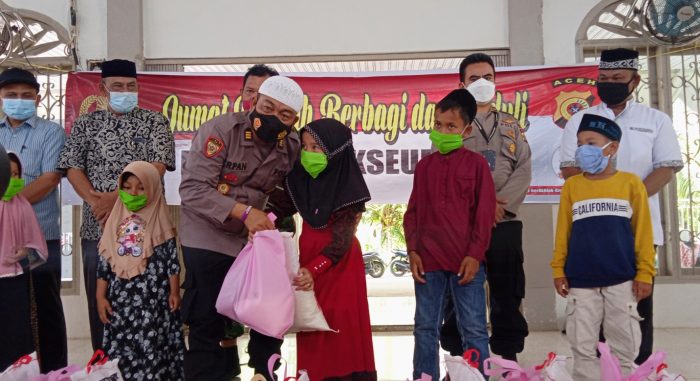 LHOKSEUMAWE – Jumat berkah berbagi dan peduli Polres Lhokseumawe di Kecamatan Samudera, Aceh Utara wilayah hukum Polres Lhokseumawe membagikan sebanyak 50 paket sembako kepada para anak yatim di Gampong Blang Peuria, Jumat (27/8/2021) siang.