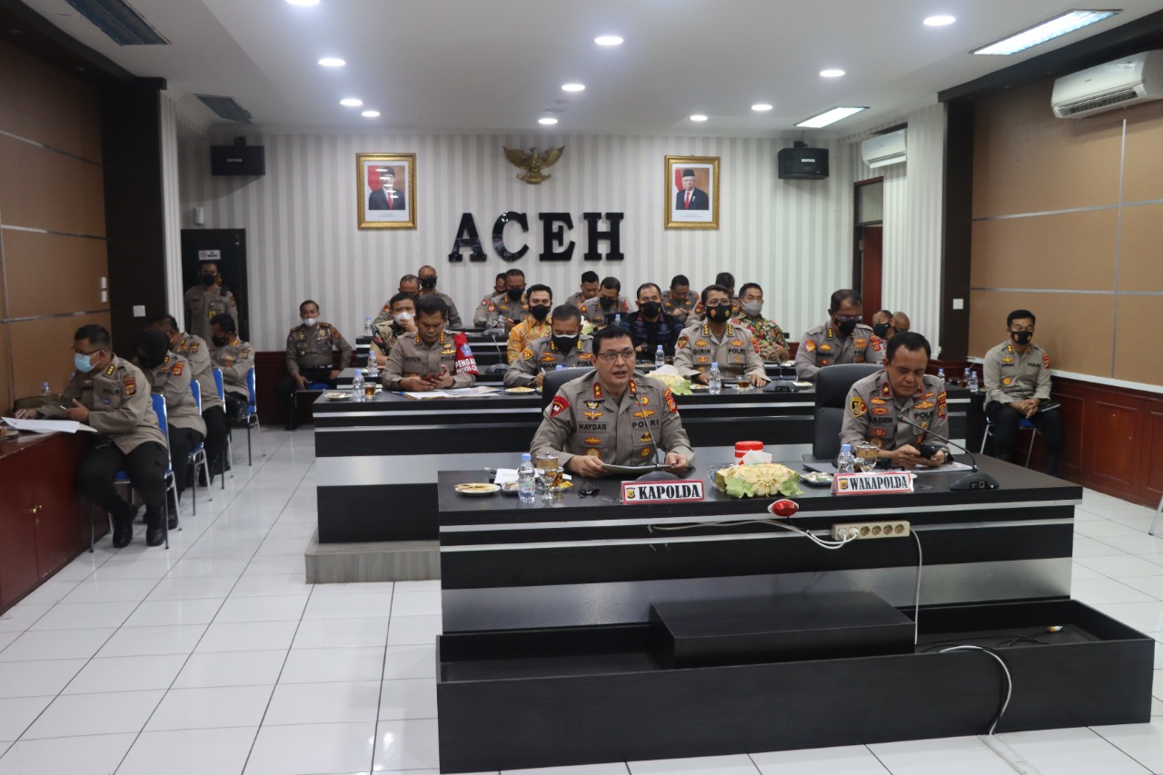BANDA ACEH – Kapolda Aceh Irjen Pol. Drs. Ahmad Haydar, S. H, M. H, memberikan arahan ke seluruh jajaran Polres secara virtual terkait penanganan Covid-19.