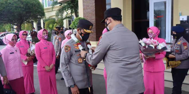 BANDA ACEH – Kapolda Aceh Irjen Pol. Drs. Ahmad Haydar, S. H., M. M, mengalungin bunga AS SDM Kapolri yang juga mantan Kapolda Aceh Irjen Pol. Drs. Wahyu Widada, M. Phil, sebelum berangkat meninggalkan Mapolda Aceh, Jum’at (13/8/21) sore.