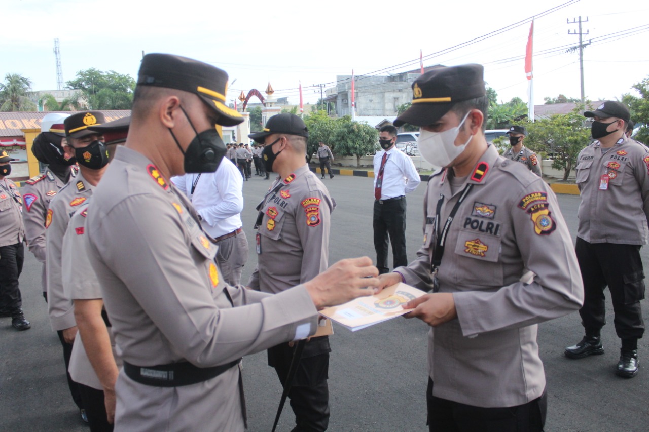LHOKSEUMAWE – Kapolres Lhokseumawe AKBP Eko Hartanto SIK MH memberikan hadiah kepada sejumlah anggota yang berulang tahun di Bulan Juli 2021 pada saat apel pagi di Mapolres Lhokseumawe, Senin (9/8/2021).