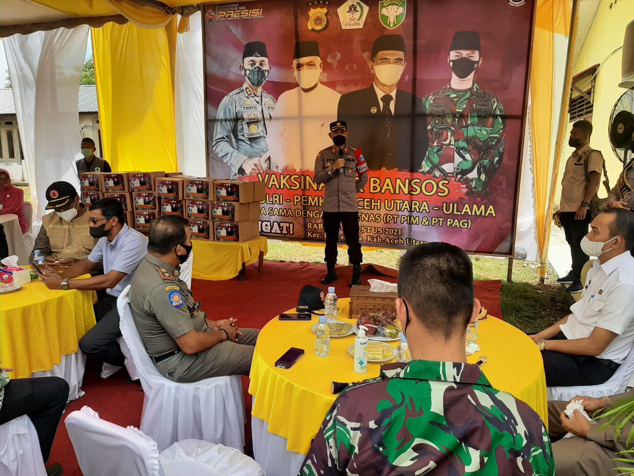 Kegiatan vaksinasi dan bansos tersebut dilaksanakan di halaman Mapolsek Dewantara, bekerjasama antara TNI, Polri, Pemkab Aceh Utara dan ulama serta Obyek vital Nasional (Obvitnas).