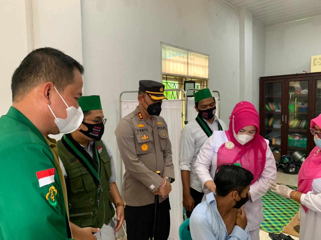 LHOKSEUMAWE – Kapolres Lhokseumawe AKBP Eko Hartanto SIK MH meninjau pelaksanaan vaksinasi massal di gedung Himpunan Mahasiswa Islam (HMI) Cabang Kota Lhokseumawe – Aceh Utara, Sabtu (31/7/2021).