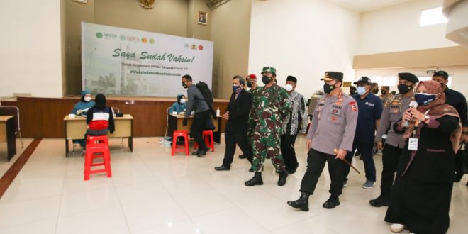 Yogyakarta – Panglima TNI Marsekal Hadi Tjahjanto dan Kapolri Jenderal Listyo Sigit Prabowo meninjau langsung pelaksanaan vaksinasi massal di Universitas ‘Aisyiyah (UNISA) Yogyakarta, Rabu (25/8/2021).