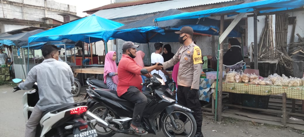 LHOKSEUMAWE – Polsek Simpang Keuramat, Polres Lhokseumawe membagikan masker kepada warga di wilayah tersebut, Jumat (6/8/2021) pagi, kegiatan tersebut merupakan sebagai langkah untuk mencegah dan menekan angka penyebaran COVID-19.