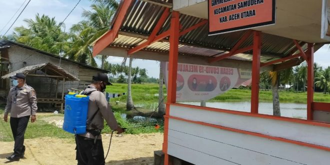 LHOKSEUMAWE – Personel Polsek Samudera, Polres Lhokseumawe melakukan sosialisasi protokol kesehatan (Prokes) dan menyemprotkan disinfektan di Gampong Keude Blang Mee Pulo Klat, Kec. Samudera, Aceh Utara, Jumat (6/8/2021) pagi.