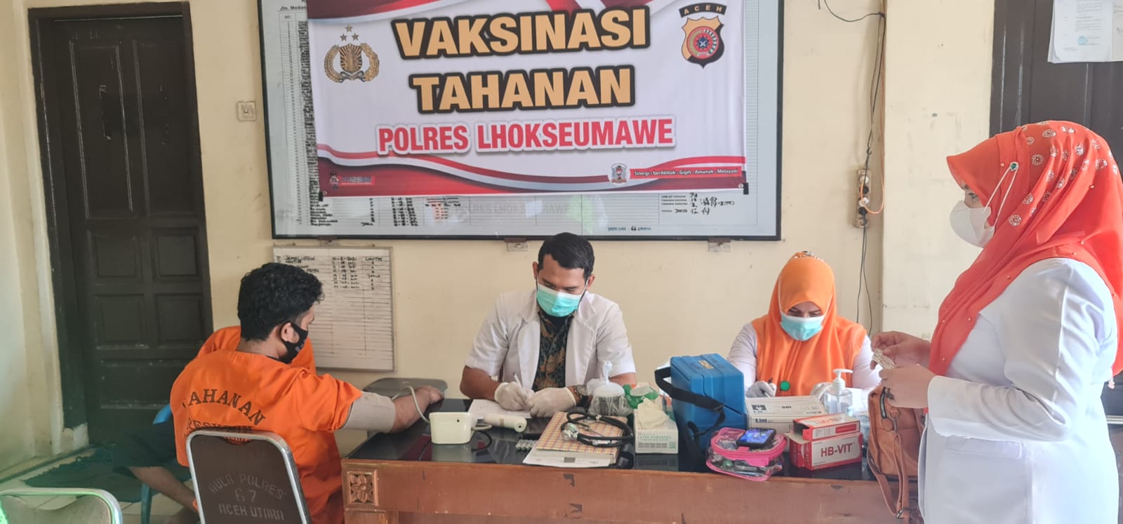 LHOKSEUMAWE – Sebanyak 52 tahanan di rutan Mapolres Lhokseumawe divaksin, Kamis (26/8/2021), kegiatan tersebut merupakan sebagai upaya memutuskan mata rantai penyebaran COVID-19.