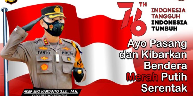 LHOKSEUMAWE – Kapolres Lhokseumawe, AKBP Eko Hartanto, S.I.K, M.H mengajak Seluruh masyarakat mengibarkan Bendera Merah Putih selama satu bulan penuh selama bulan Agustus 2021 dalam rangka menyambut Hari Ulang Tahun (HUT) ke-76 Republik Indonesia.