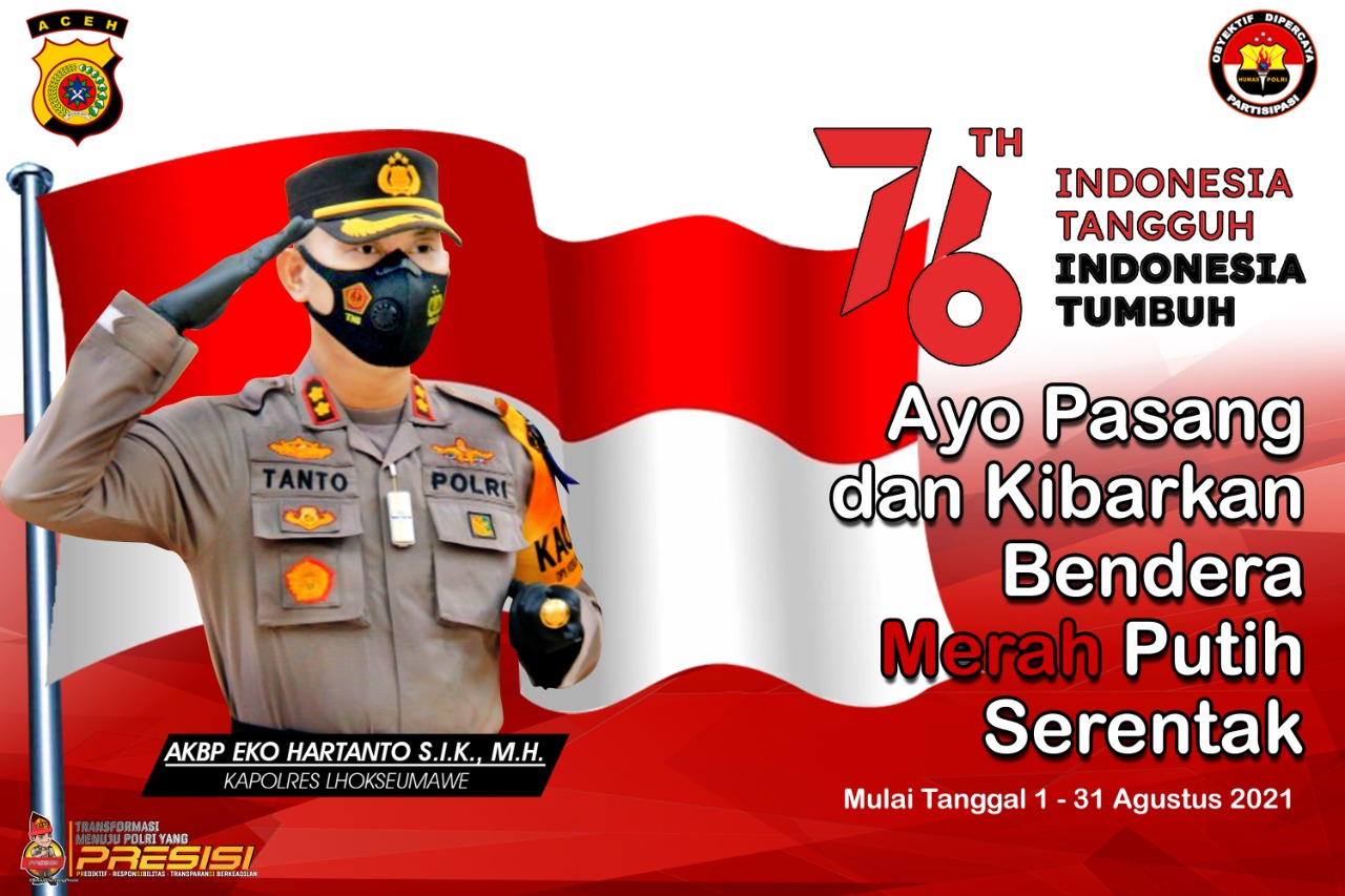 LHOKSEUMAWE – Kapolres Lhokseumawe, AKBP Eko Hartanto, S.I.K, M.H mengajak Seluruh masyarakat mengibarkan Bendera Merah Putih selama satu bulan penuh selama bulan Agustus 2021 dalam rangka menyambut Hari Ulang Tahun (HUT) ke-76 Republik Indonesia.