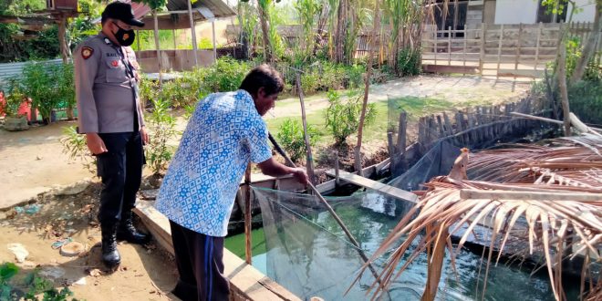 LHOKSEUMAWE – Personil Polsek Banda Sakti melaksanakan sosialisasi ketahanan pangan di masa pandemi COVID-19, personel Polsek Banda Sakti, Polres Lhokseumawe mengecek tambak ikan milik masyarakat di Gampong Keude Aceh, Banda Sakit, Kota Lhokseumawe, Senin (23/8/2021).