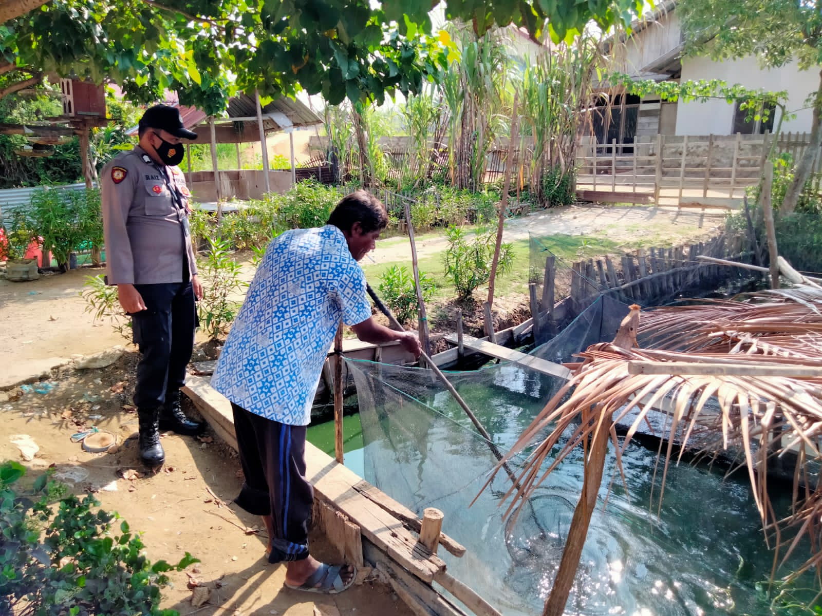 LHOKSEUMAWE – Personil Polsek Banda Sakti melaksanakan sosialisasi ketahanan pangan di masa pandemi COVID-19, personel Polsek Banda Sakti, Polres Lhokseumawe mengecek tambak ikan milik masyarakat di Gampong Keude Aceh, Banda Sakit, Kota Lhokseumawe, Senin (23/8/2021).