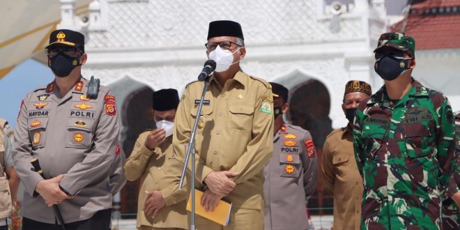 Sejumlah Pejabat Forkopimda Aceh terdiri dari Gubernur Aceh Ir. Nova Iriansyah, M. T, Kapolda Aceh Irjen Pol. Drs. Ahmad Haydar, S. H. M. M, dan Pangdam IM Mayjen TNI Ahmad Marzuki meninjau berlangsungnya pelaksanaan vaksinasi merdeka yang digelar di halaman Masjid Raya Baiturrahman, Banda Aceh, Selasa (7/9/21).