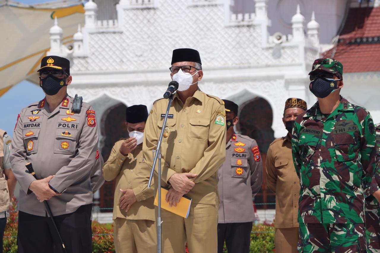 Sejumlah Pejabat Forkopimda Aceh terdiri dari Gubernur Aceh Ir. Nova Iriansyah, M. T, Kapolda Aceh Irjen Pol. Drs. Ahmad Haydar, S. H. M. M, dan Pangdam IM Mayjen TNI Ahmad Marzuki meninjau berlangsungnya pelaksanaan vaksinasi merdeka yang digelar di halaman Masjid Raya Baiturrahman, Banda Aceh, Selasa (7/9/21).