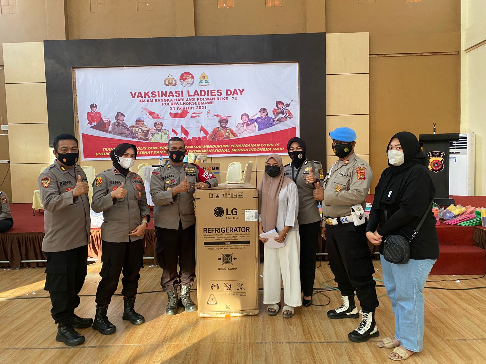 LHOKSEUMAWE – Kapolres Lhokseumawe AKBP Eko Hartanto SIK MH diwakili Wakapolres Lhokseumawe, Kompol Raja Gunawan menyerahkan hadiah kepada pemenang door prize Vaksinasi Ladies Day dalam rangka HUT Polwan ke 73 di gedung serbaguna Wira Satya Mapolres Lhokseumawe, Minggu (5/9/2021) sore.