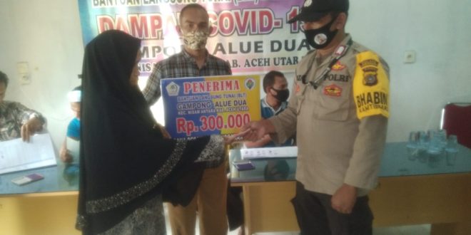 LHOKSEUMAWE – Personel Sub Sektor Nisam Antara, Polres Lhokseumawe melakukan pengamanan terhadap penyaluran Bantuan Langsung Tunai (BLT) di Gampong Alue Dua, Kec. Nisam Antara, Aceh Utara, Kamis (2/9/2021).