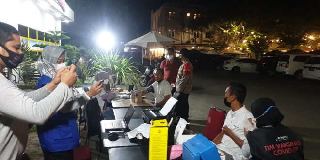 LHOKSEUMAWE – Polres Lhokseumawe bersama tim nakes setempat melakukan berbagai cara untuk mensukseskan program percepatan vaksinasi Nasional, termasuk dengan dengan cara menggaet kaum milenial yang sedang nongkrong di kafe pada malam hari di Kota Lhokseumawe, Rabu (13/10/2021) malam.