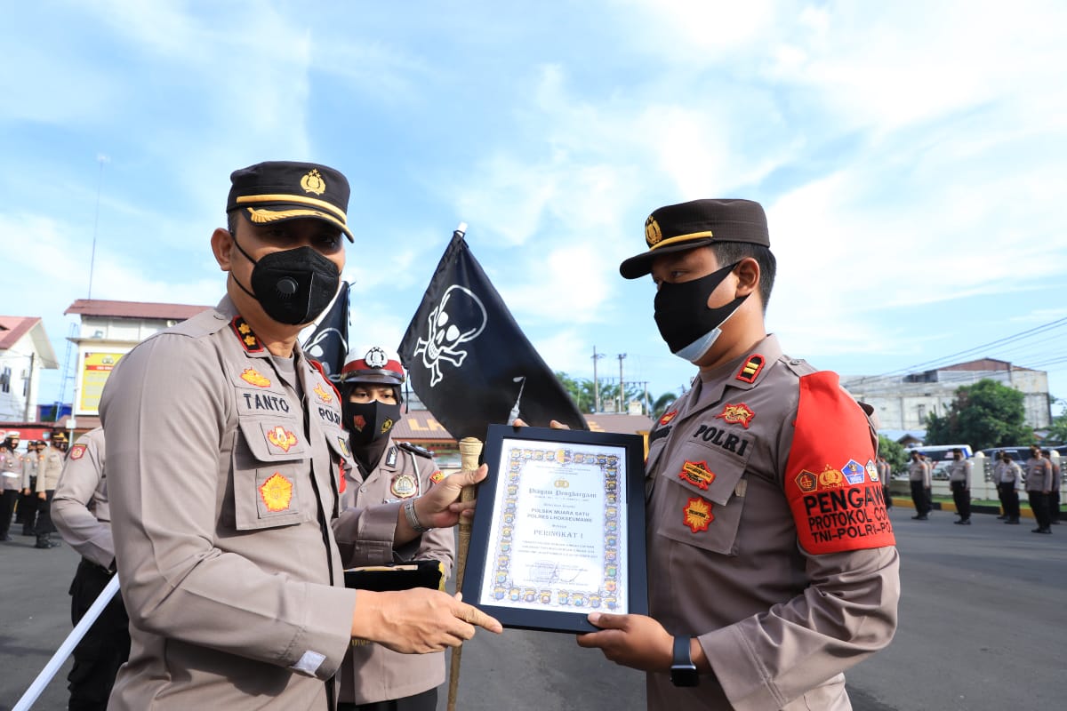 LHOKSEUMAWE – Kapolres Lhokseumawe AKBP Eko Hartanto SIK MH memberikan penghargaan kepada Kapolsek Muara Satu, Iptu Muhammad Hadimas karena berhasil membangkitkan animo masyarakat dan menjadi daerah tertinggi angka vaksinasi di wilayah hukum Polres Lhokseumawe.
