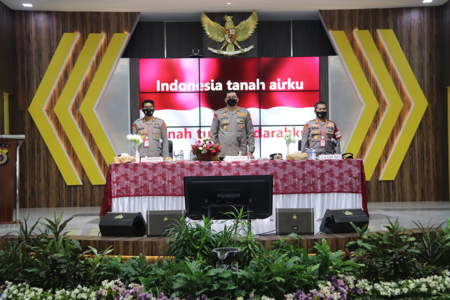 Banda Aceh – Kepala Kepolisian Daerah (Kapolda) Aceh Irjen Pol. Drs. Ahmad Haydar, S.H., M.M., yanga didampingi Irwasda Kombes Pol. Drs. Marzuki Ali Basyah, MM dan Karo Ops Polda Aceh Kombes Pol. Drs. H. Agus Sarjito, memimpin kegiatan Gelar Operasional (GO) yang diikuti oleh para Pejabat Utama Polda Aceh beserta Kapolres Jajaran, Rabu (6/10/2021) di Aula Presisi Mapolda Aceh.