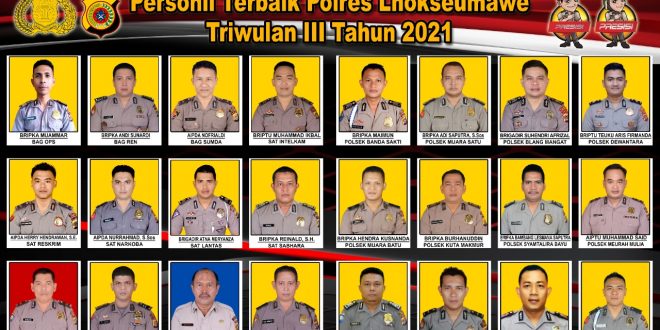LHOKSEUMAWE – Polres Lhokseumawe kembali memajang foto personel terbaik untuk Triwulan III tahun 2021 di ruang lobi gedung Mapolres Lhokseumawe.