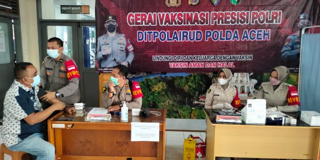 BANDA ACEH – Tiga satuan kerja jajaran Polda Aceh, masing-masing Ditresnarkoba Polda Aceh, Ditpolairud Polda Aceh dan Polres Aceh Besar bergabung menggelar gerai vaksinasi presisi Polri di sejumlah lokasi dalam wilayah Kota Banda Aceh dan Aceh Besar, Jum’at (8/10/21).