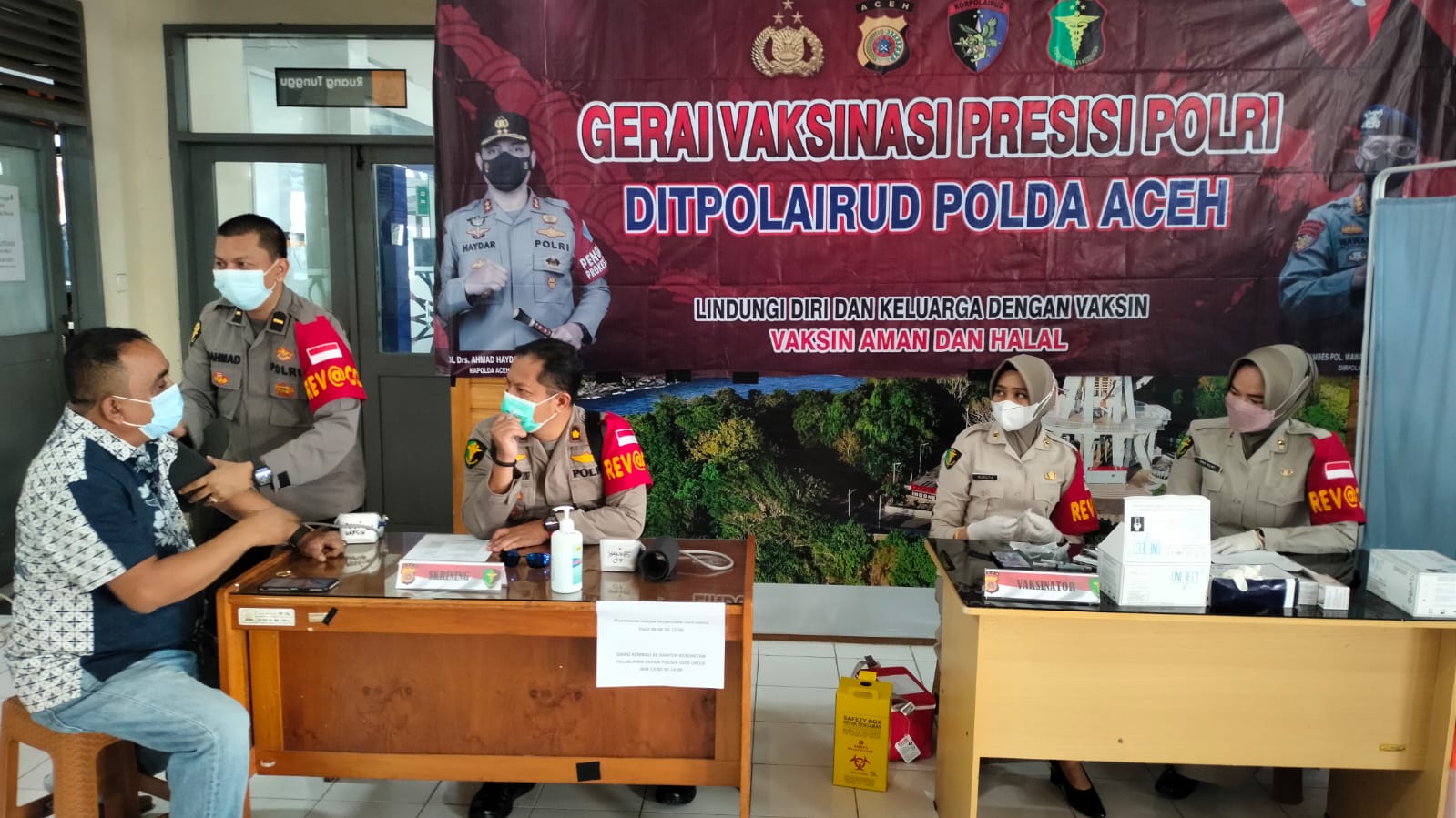 BANDA ACEH – Tiga satuan kerja jajaran Polda Aceh, masing-masing Ditresnarkoba Polda Aceh, Ditpolairud Polda Aceh dan Polres Aceh Besar bergabung menggelar gerai vaksinasi presisi Polri di sejumlah lokasi dalam wilayah Kota Banda Aceh dan Aceh Besar, Jum’at (8/10/21).