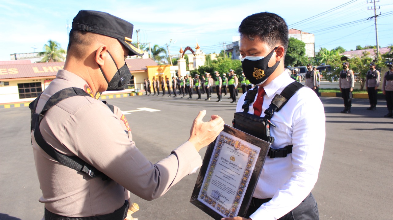 LHOKSEUMAWE- Polres Lhokseumawe menggelar upacara pemberian penghargaan kepada 21 personil Satnarkoba Polres Lhokseumawe yang berlangsung di halaman Mapolres Lhokseumawe, Senin (22/11/2021) pagi.