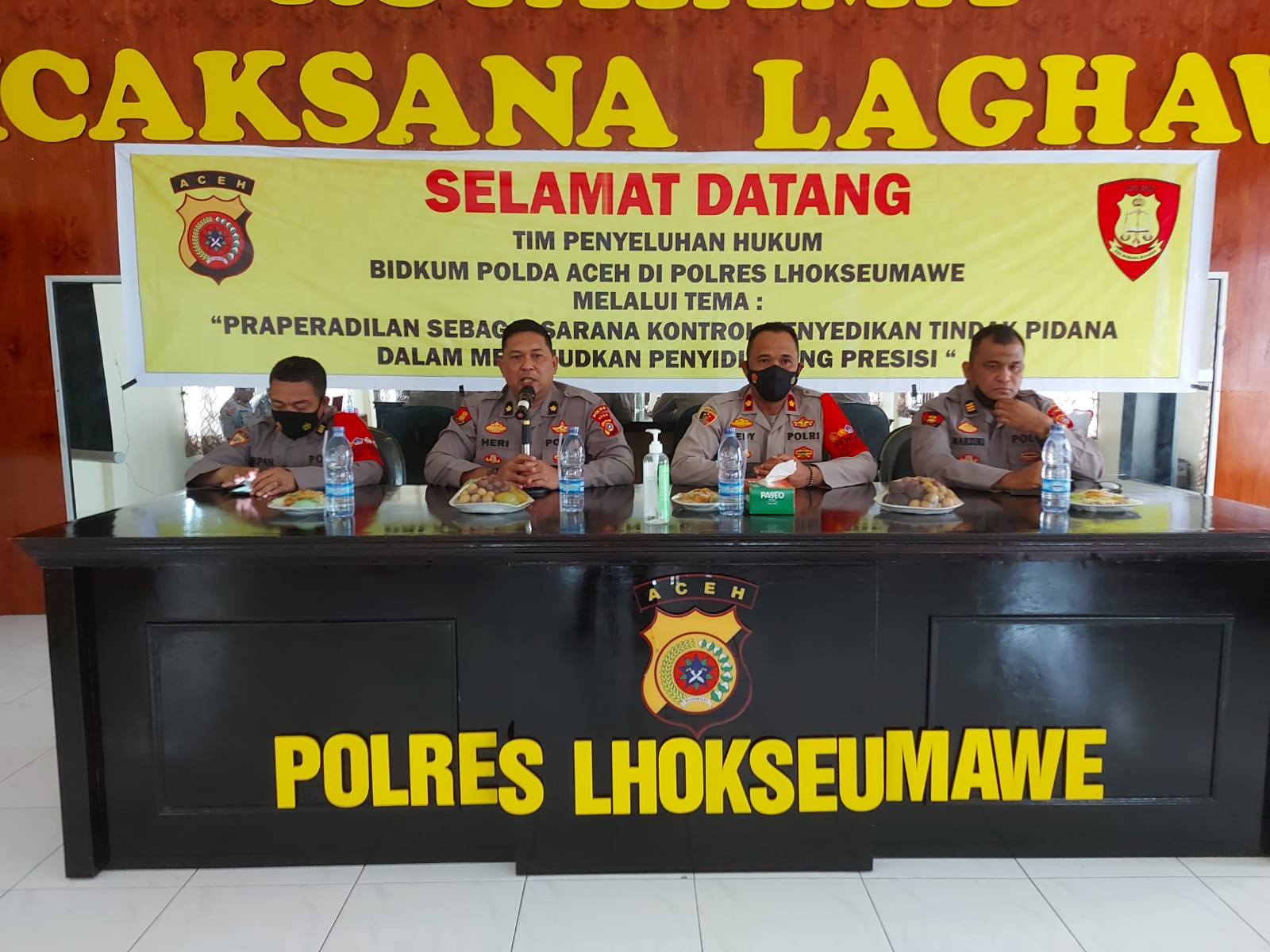 LHOKSEUMAWE- Penyidik Polres Lhokseumawe dibekali penyuluhan hukum dari Bidkum Polda Aceh dengan tema Praperadilan sebagai sarana kontrol penyidikan tindak pidana dalam mewujudkan penyidik yang presisi yang berlangsung di Aula Rupatama Laghawa Polres Lhokseumawe, rabu (3/11/2021) pagi.