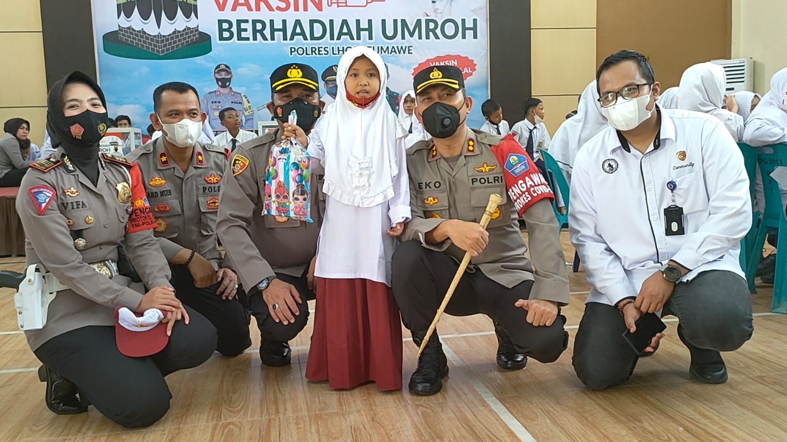 Bahkan Kapolres Lhokseumawe langsung menemani Imelda aurel Azmi (7 thn) siswi kelas 1 SDN 8 Lhokseumawe untuk di vaksin. Kapolres tampak akrab dan berinteraksi serta memberikan hadiah bingkisan snack kepada Imelda saat mengikuti tahapan vaksinasi.