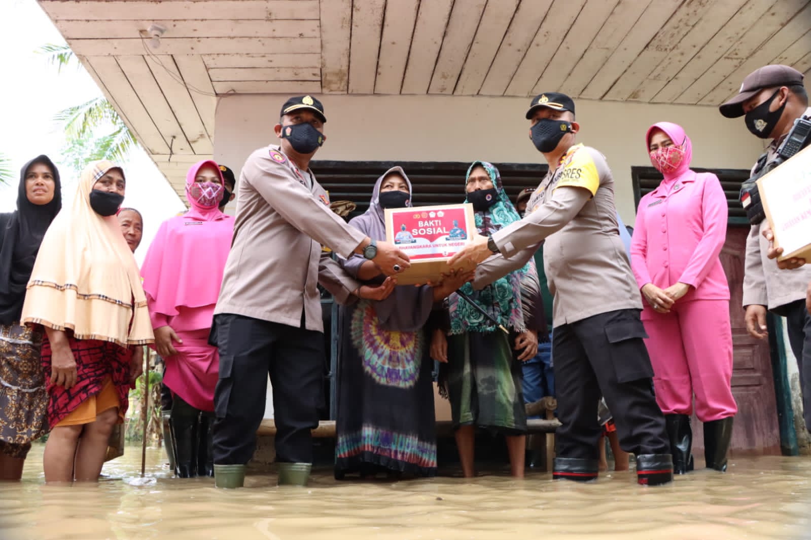 LHOKSEUMAWE- Kapolres Lhokseumawe didampingi Ketua Bhayangkari dan sejumlah pejabat utama Polres Lhokseumawe mengunjungi dan membantu korban banjir di Gampong Asan Kareung, Kecamatan Blang Mangat, Kota Lhokseumawe, Sabtu (1/1/2022) siang.
