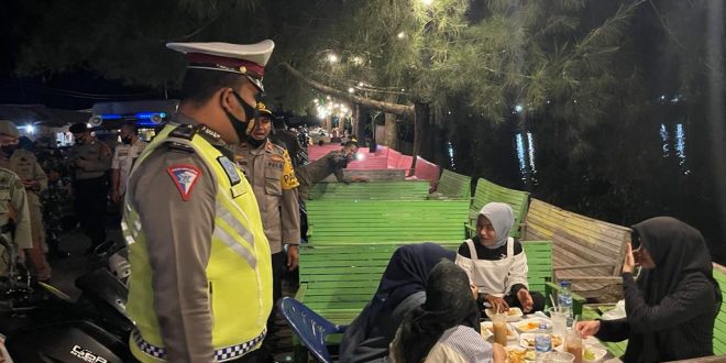 LHOKSEUMAWE – Personel Polres Lhokseumawe bersama tim gabungan Operasi Yustisi memantau penerapan protokol kesehatan (prokes) di seputaran Waduk Kota Lhokseumawe, Rabu (5/1/2022) malam.