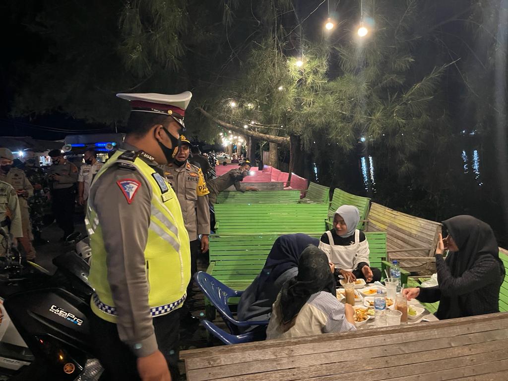 LHOKSEUMAWE – Personel Polres Lhokseumawe bersama tim gabungan Operasi Yustisi memantau penerapan protokol kesehatan (prokes) di seputaran Waduk Kota Lhokseumawe, Rabu (5/1/2022) malam.