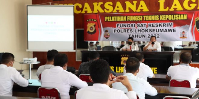 LHOKSEUMAWE – Personel Satreskrim dan Kanit Polsek jajaran Polres Lhokseumawe Dibekali Materi Terkait Tindak Pidana Perdagangan Orang (TPPO), kegiatan pelatihan dimaksud berlangsung di Aula Rupatama Wicaksana Laghawa Polres Lhokseumawe, Sabtu (22/1/2022).