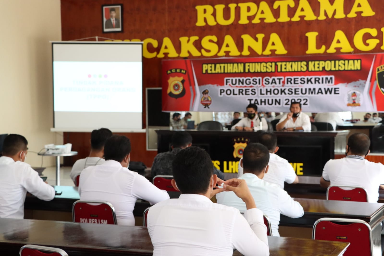 LHOKSEUMAWE – Personel Satreskrim dan Kanit Polsek jajaran Polres Lhokseumawe Dibekali Materi Terkait Tindak Pidana Perdagangan Orang (TPPO), kegiatan pelatihan dimaksud berlangsung di Aula Rupatama Wicaksana Laghawa Polres Lhokseumawe, Sabtu (22/1/2022).