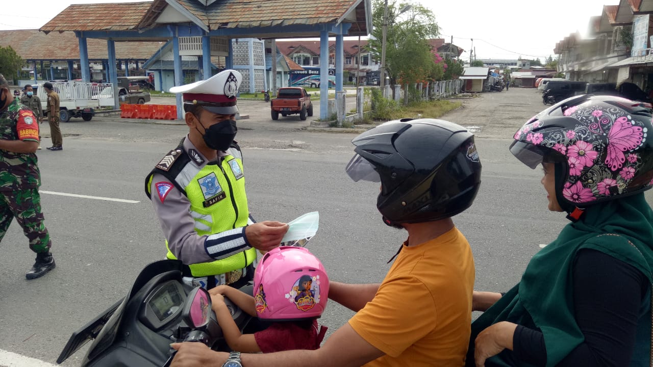 LHOKSEUMAWE – Polres Lhokseumawe bersama tim gabungan terus mengingatkan masyarakat untuk mematuhi protokol kesehatan (prokes) dalam Operasi Yustisi di depan terminal bus tipe A, Mon Geudong, Banda Sakti, Kota Lhokseumawe, Rabu (26/1/2022) pagi.