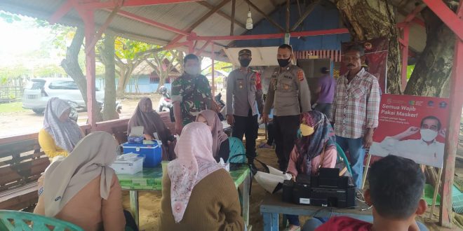 LHOKSEUMAWE – Guna mensukseskan program percepatan vaksinasi Nasional, Polsek Muara Satu, Polres Lhokseumawe menyediakan gerai vaksin di lokasi wisata pantai Rancong, Muara Satu, Kota Lhokseumawe, Minggu (2/1/2022).