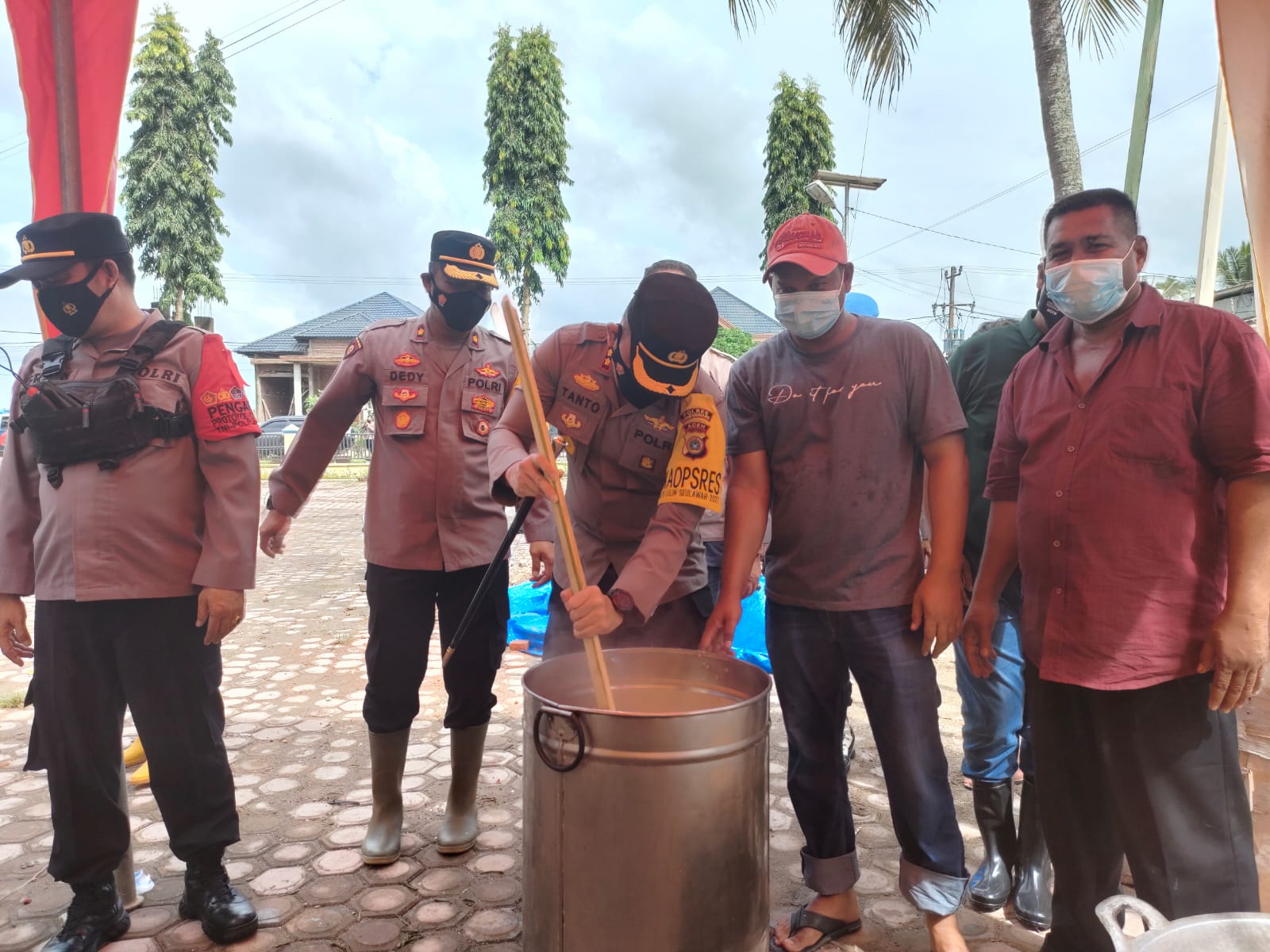 Dilokasi Kapolres Lhokseumawe tak segan mengaduk masakan di wajan besar diatas tungku dapur umum dihadapan warga.