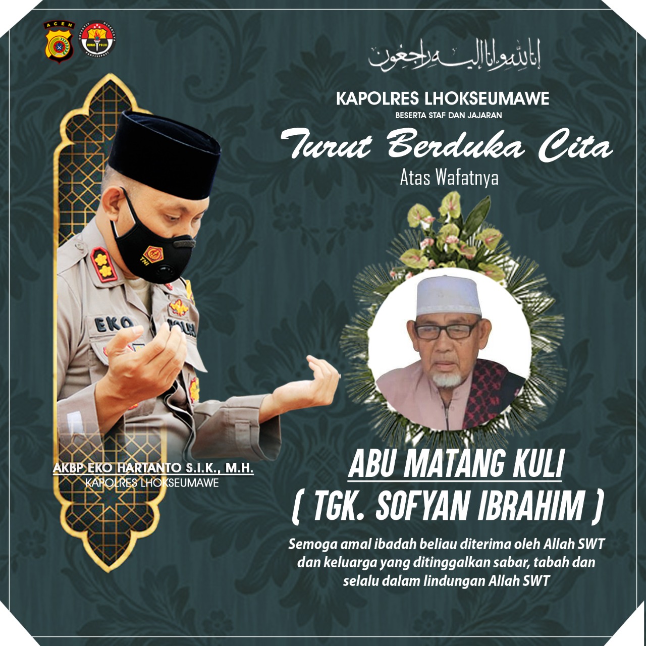 “Kapolres Lhokseumawe beserta staf dan jajaran mengucapkan duka cita sedalam-dalamnya atas berpulangnya ke Rahmatullah Tgk Sofyan Ibrahim (Abu Matang Kuli),” ujar Kapolres Lhokseumawe.